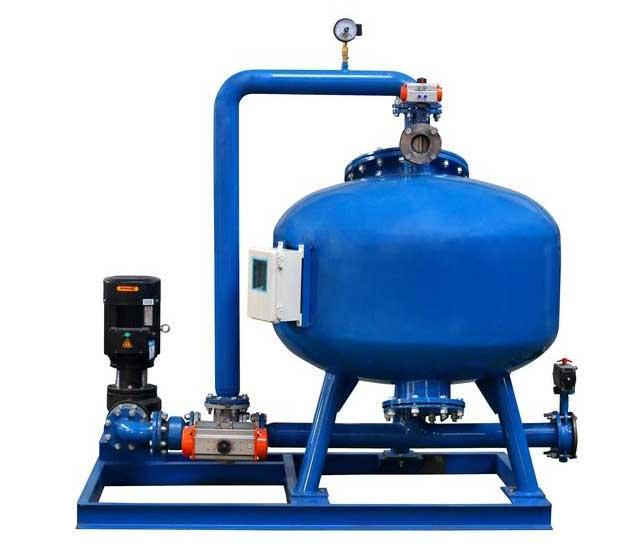 浅层砂过滤器是由过滤罐体、冲洗阀和冲洗控制器组成,水流进入过滤器后,通过砂石污物(可至50μm)截留下来,出水即为净水。污物聚集在砂石滤层上,使滤层表面和出水形成压力差。当压差达到预设值时,便启动自清洗程序。压差传感器将信号传至控制器触动其打开冲洗阀、反清洗滤层上的污物,当滤层冲洗干净,控制器关闭冲洗阀。启动下一个过滤罐反冲洗阀,直到过滤罐。设备自动恢复到全滤状态。系统不间断供水,排污压力损失不超过0.5bar,流量损失不超过1%。